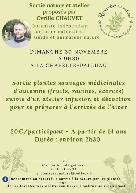 Au fil d’une balade pour apprendre à reconnaître et récolter les plantes sauvages médicinales d’hiver (sauvages ou cultivées), je vous initierai à la récolte de racines, de fruits et d’écorces. Je vous guiderai ensuite dans les différentes étapes pour les utiliser en infusion et en décoction afin de préparer votre corps à l'arrivée de l'hiver et de l’aider à lutter en cas d’infection. Nous profiterons de cette matinée conviviale pour déguster nos préparations.